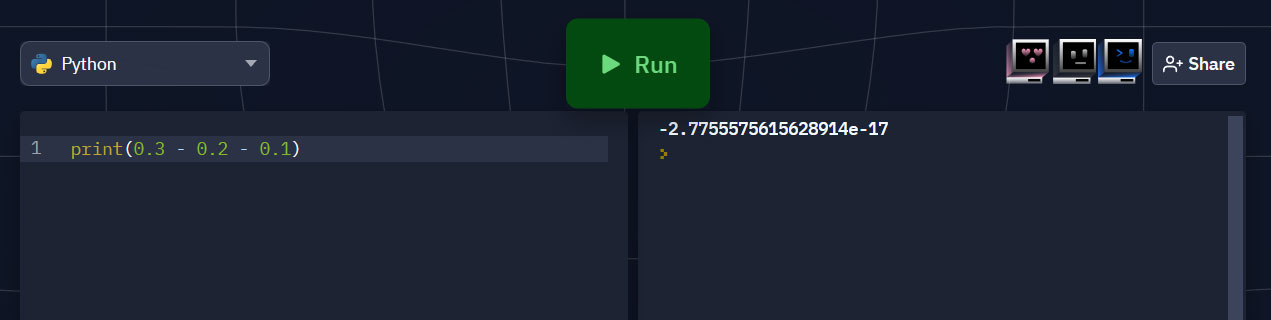 먼저 파이썬 인터프리터를 실행하여 0.3 - 0.2 - 0.1 의 계산 결과를 알아 보았습니다. >>> 0.3 - 0.2 - 0.1 -2.7755575615628914e-17 계산 결과가 왜 0이 아닌 엉뚱한 값 -2.7755575615628914e-17 이 될까요? IEEE754 에 대해서는 관련되는 두 문서 [1] Double-precision floating-point format [2] Floating Point Arithmetic: Issues and Limitations 를 참고하기 바랍니다. NET Framework 4.6.x 이상에서 사용가능한 NET용 분수 계산 라이브러리를 소개합니다. (소스 수정 없이 NET Core 5.0 이상에서도 사용 가능합니다.) (Mac OS 에서도 Fract..